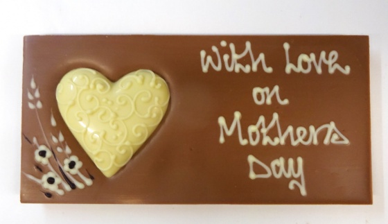 Milk Chocolate Bar with white and dark chocolate detail. With love on Mothers Day with milk chocolate heart (200g) Approx size 19cm x 9cm. (ALLERGY ADVICE: MILK, SOYA)